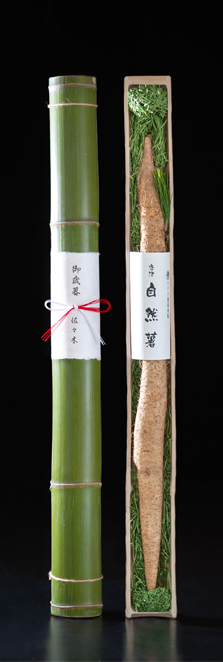 特大の自然薯を青竹に入れた最高級自然薯です。贈り物にとてもインパクトのあるお薯です。
