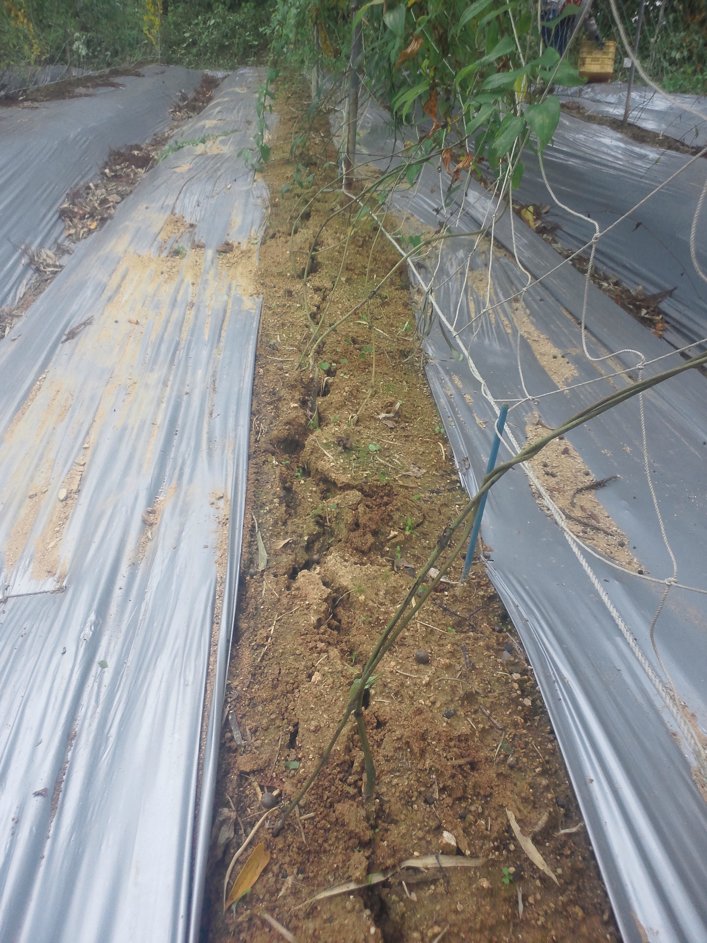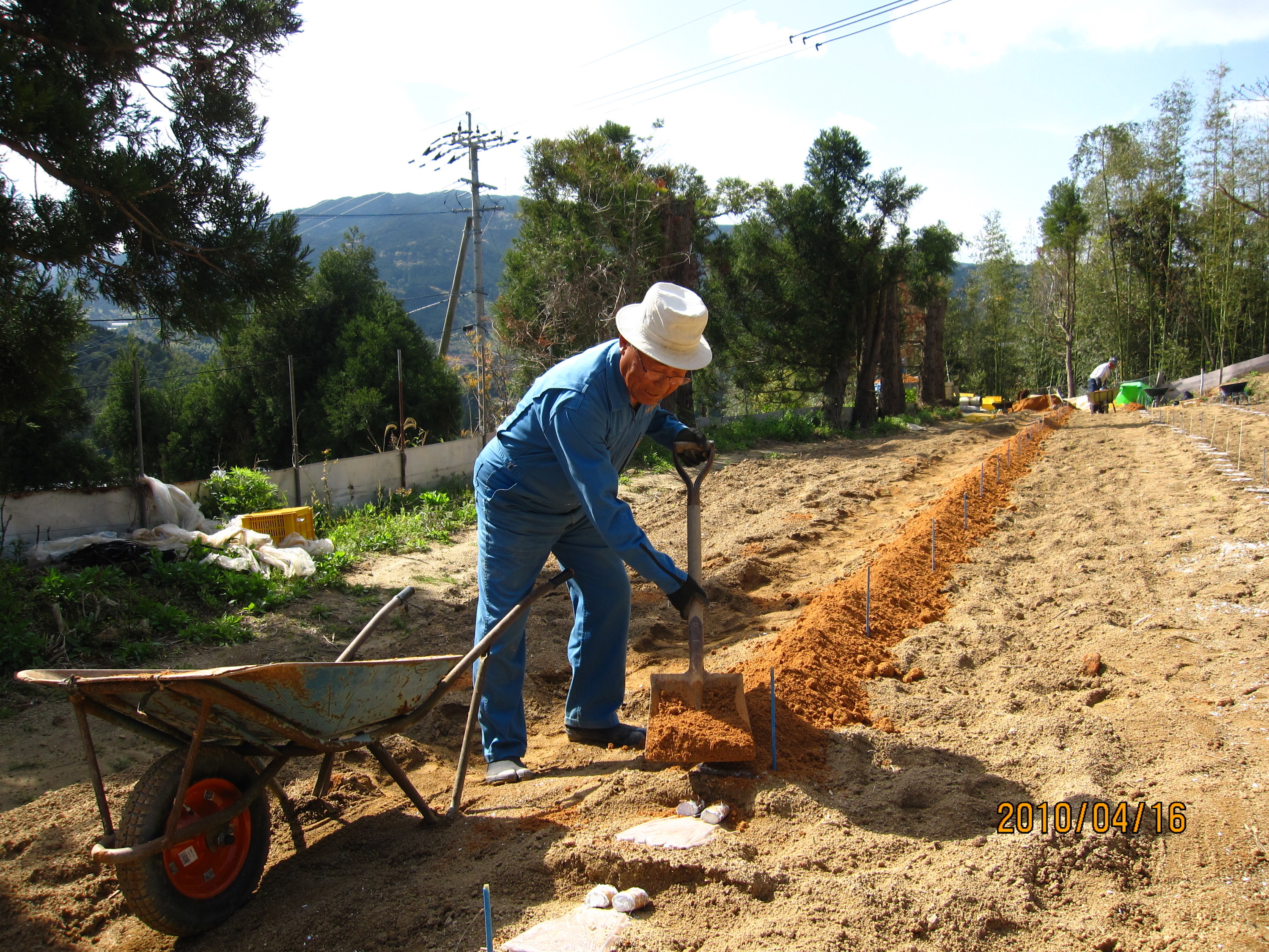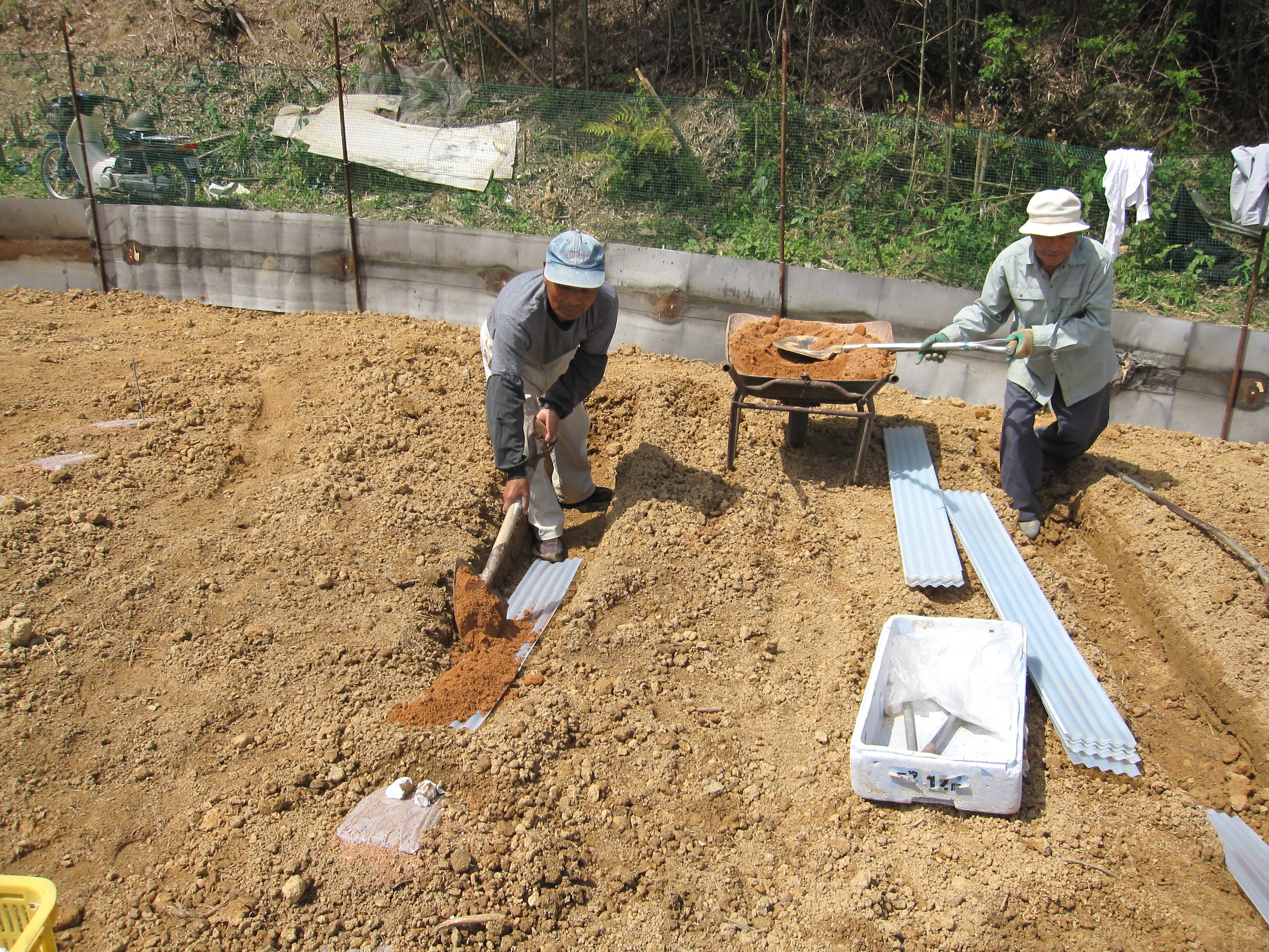 容器の設置風景。一日に、80枚を設置するのが限界です。骨が折れる仕事で大変ですが、自然薯が一年育つ容器なので、丁寧に設置していきます。自然薯にふかふかのベットを用意している感覚です。
