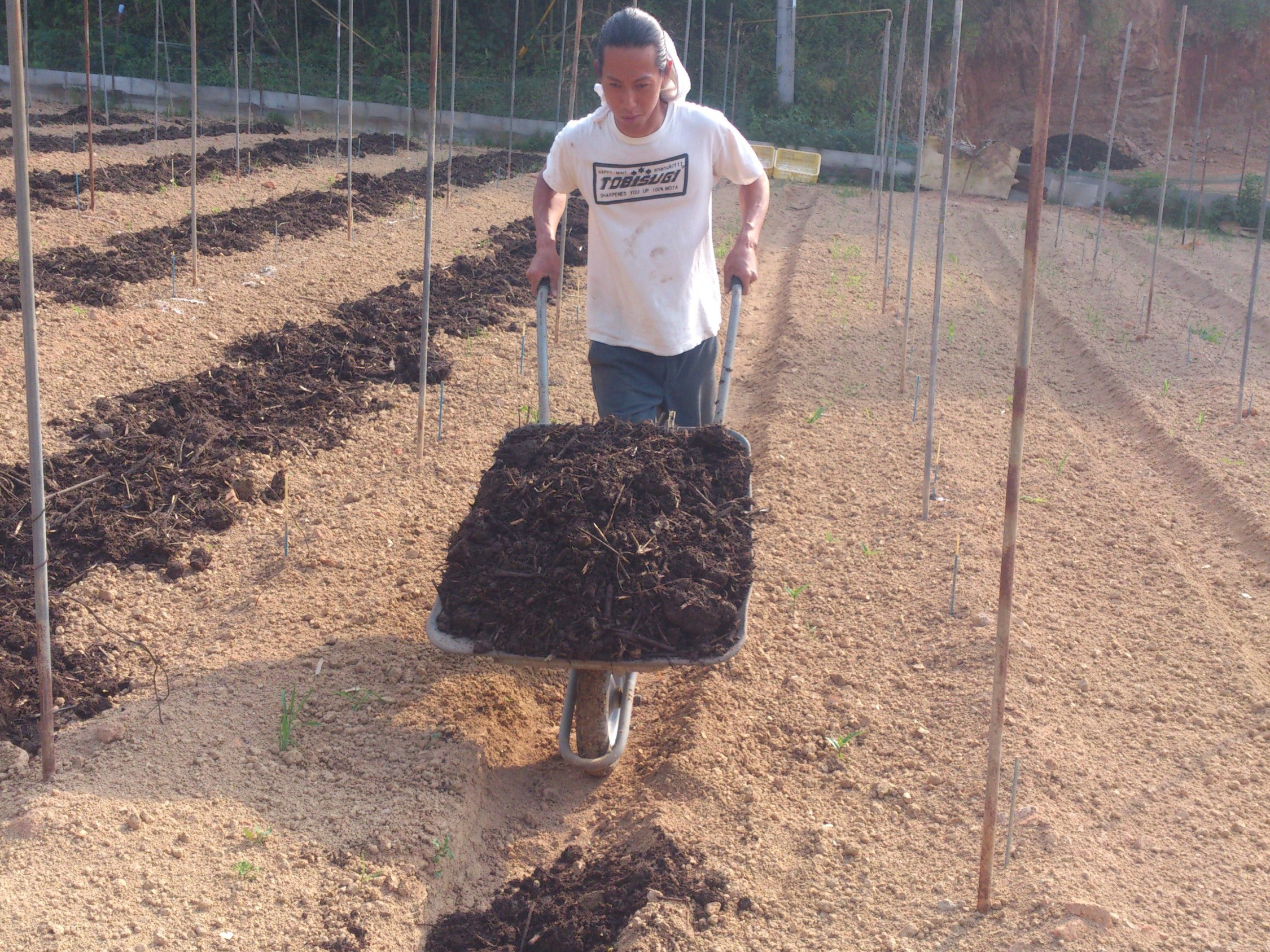 化学肥料をまくと手のひら一杯で済みますが、ささき農園で自作している肥料だと一輪車一台分に相当します。