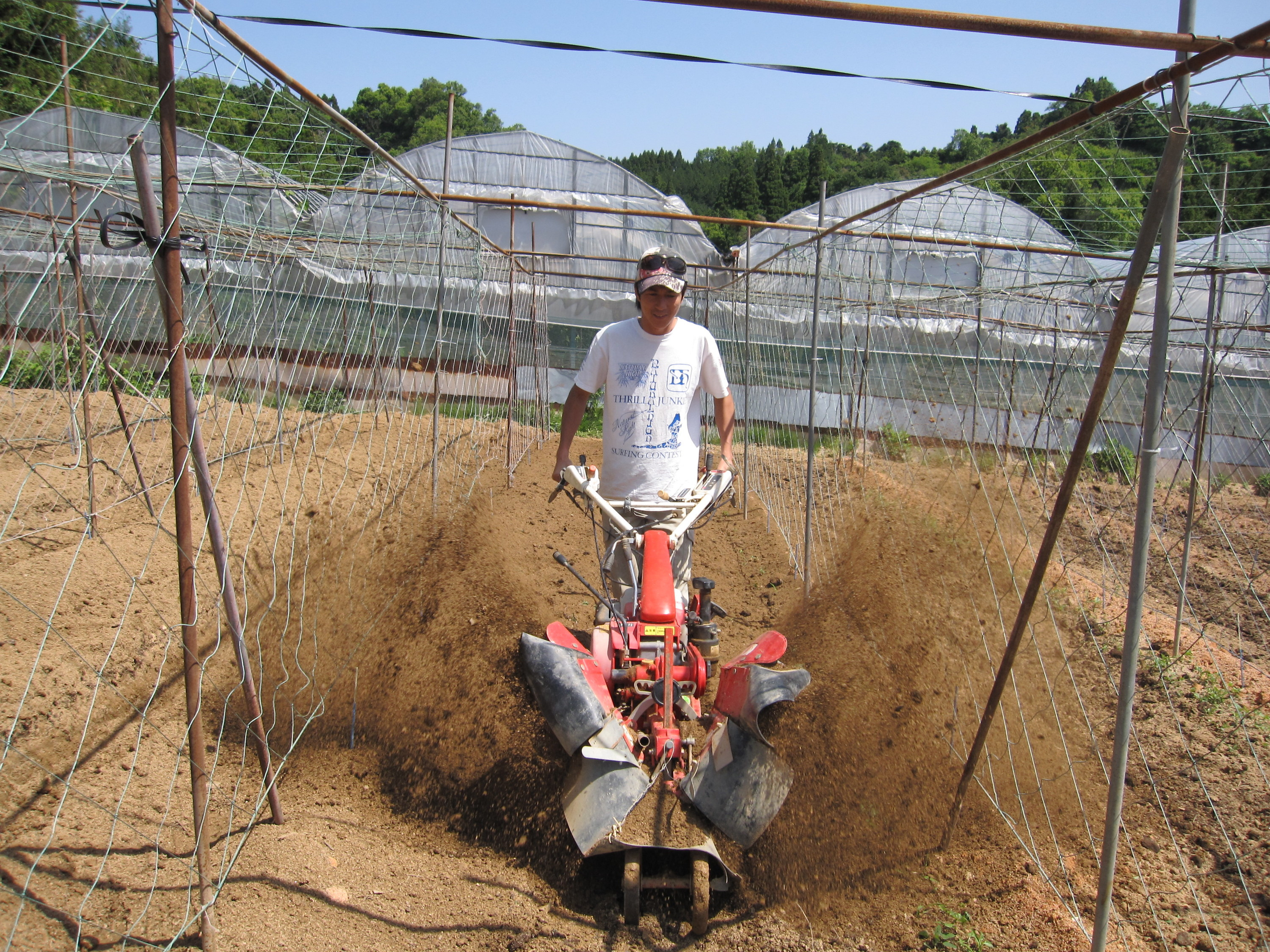 まずは農業のノウハウを勉強するために86歳の祖父に弟子入りし、自然薯、里芋、さつまいも、ごぼう、すいか、とうもろこし、なす、きゅうりなど基本的な野菜の栽培技術を学びました。その中で農薬や化学肥料とアレルギーやうつ病といった現代病などの関係を学習し、無農薬、無化学肥料への挑戦を始めました。