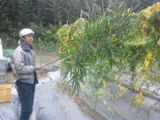 ムカゴの収穫。竹の笹で叩いて落とします。その年の天候によって、収穫量が変わります。